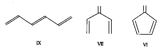 Eine weitere Bedingung, die oft zur Definition von Kreuzkonjugation angeführt wird, ist die, daß die beiden Doppelbindungen zwar in Konjugation zu einer dritten Doppelbindung stehen, jedoch nicht miteinander konjugiert sind. Das gilt zwar für das Methylenpentadien (VII), nicht jedoch für das cyclische Analogon Fulven (VI), das meist jedoch ebenfalls als kreuzkonjugierte Verbindung betrachtet wird.