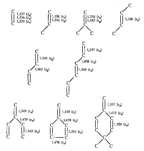 Eine weitere Doppelbindung kann an das Butadien auf zweierlei Weise "angefügt" werden. So erhält man entweder das linear konjugierte 1,3,5-Hexatrien (IX) oder das kreuzkonjugierte 3-Methylen-1,4-pentadien (VII). Im Hexatrien wurde die Länge (ra) der zentralen Doppelbindung, welche mit zwei anderen Doppelbindungen in Konjugation steht, zu 1,368 Å (trans) bzw. 1,362 Å (cis) bestimmt, was eine ganz erhebliche Verlängerung gegenüber dem Ethen darstellt. Für die beiden äußeren Doppelbindungen wurden Bindungslängen von 1,337 Å gefunden, was genau dem (rg-)Wert für das Ethen entspricht.