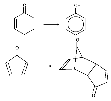 kreuzkonjugierter Verbindungen: Tautomerie des Cyclohexadienon/Phenol-Systems (oben) und Dimerisierung von Cyclopentadienon (unten). |