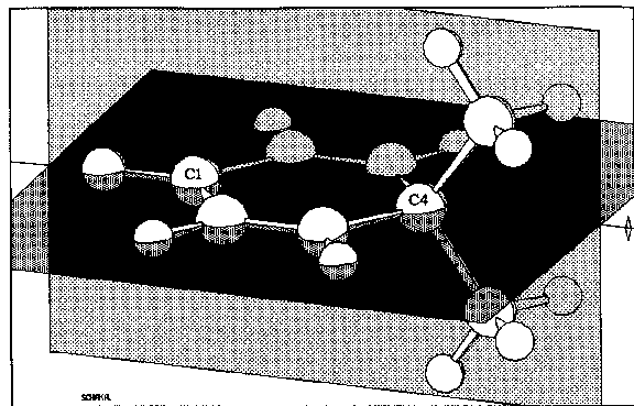 Alle diese Moleküle besitzen sehr ähnliche Symmetrie-Eigenschaften. Ein Symmetrieelement, das immer vorhanden ist, ist eine Spiegelebene senkrecht zum Ring, welche die Kohlenstoffatome C1 und, im Fall der Sechsringe, C4 enthält1 (vgl. Abb. C.1). Im Fall eines nicht-ebenen Ringes stellt diese Ebene das einzige Symmetrieelement dar und die resultierende Symmetriegruppe ist CS. Ist der Ring eben, dann bildet eben diese Ringebene eine zweite Symmetrieebene, die senkrecht auf der ersten steht. Dies bedingt gleichzeitig eine zweizählige Achse, die durch die Schnittlinie der beiden Spiegelebenen definiert wird. Die molekulare Symmetrie ist dann C2v.