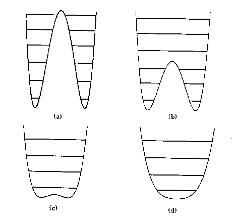 Aber auch eine geringe Faltung des Ringes kann aus der qualitativen Auswertung der Spektren der deuterierten und der undeuterierten Spezies nahezu ausgeschlossen werden. Dazu sollen im folgenden verschiedene Fälle bezüglich der Potentialfunktion der Knickschwingung des Ringes diskutiert werden (vgl. [46]):