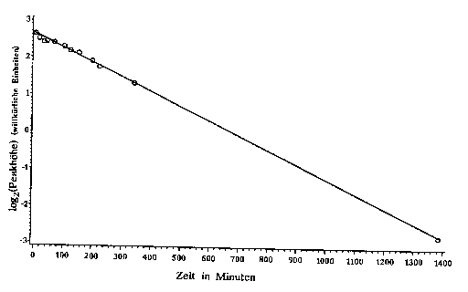 Gajevski und Gortva [6b] geben an, das MCHD gaschromatographisch gereinigt zu haben. Es schien daher die Möglichkeit zu bestehen, die Messungen statisch durchzuführen, was natürlich im Vergleich zu einer Messung im Durchfluß eine erhebliche Substanzersparnis bedeutete. So wurde also die Zelle mit etwa 5 Pa (0,05 mbar) MCHD befüllt und über einen Zeitraum von fast 24 Stunden die Intensität einer bestimmten Linie verfolgt. Eine logarithmische Auftragung (zur Basis 2) ergab eine gute Korrelation bezüglich einer Ausgleichsgeraden (vgl. Abb. E.5). Die Steigung der Geraden entspricht der reziproken Halbwertszeit einer Reaktion erster Ordnung*. Aus den gemessenen Werten ergab sich eine Halbwertszeit t½ von etwa 4 Stunden und 20 Minuten. Es war also möglich, mit zwei Zellfüllungen pro Tag zu messen.