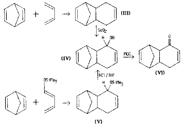 über eine Diels-Alder-Reaktion zwischen Butadien und Norbornadien (nach [6]) und eine Oxidation des Kohlenwasserstoffs (III) mit Selendioxid zum entsprechenden Allylalkohol (IV). Beim