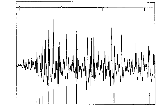 Durch gezieltes Suchen nach Linienpaaren mit Abständen, wie sie bereits für den Schwingungsgrundzustand zugeordnet waren, konnte eine Serie von Linien ausgemacht werden, die von einem angeregten Schwingungszustand herrührt. Das Intensitätsverhältnis der Linien des Grundzustandes und dieses angeregten Zustandes ist etwa 3:1, was bei der Meßtemperatur von -30°C einer Schwingungsfrequenz von 185 cm-1 entspricht. Diese Linien gehören also nicht zu der oben angeführten Schwingung, sondern zur nächsthöheren (n36, vgl. Abb. E.3), deren Frequenz mit 233 cm-1 berechnet wurde. Die Skalierung mit dem Faktor 0,8 ergibt hier eine Frequenz von 186 cm-1. Im gemessenen Spektrum findet sich in der Tat eine Bande bei 185 cm-1.